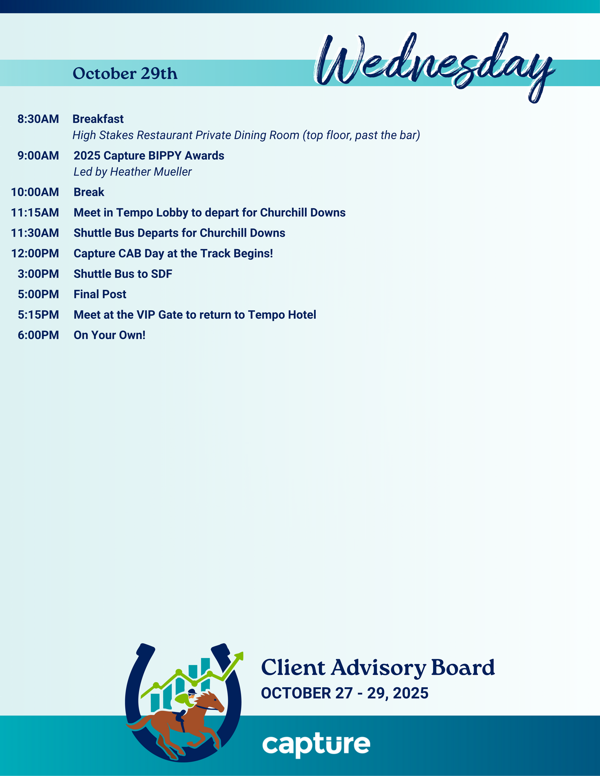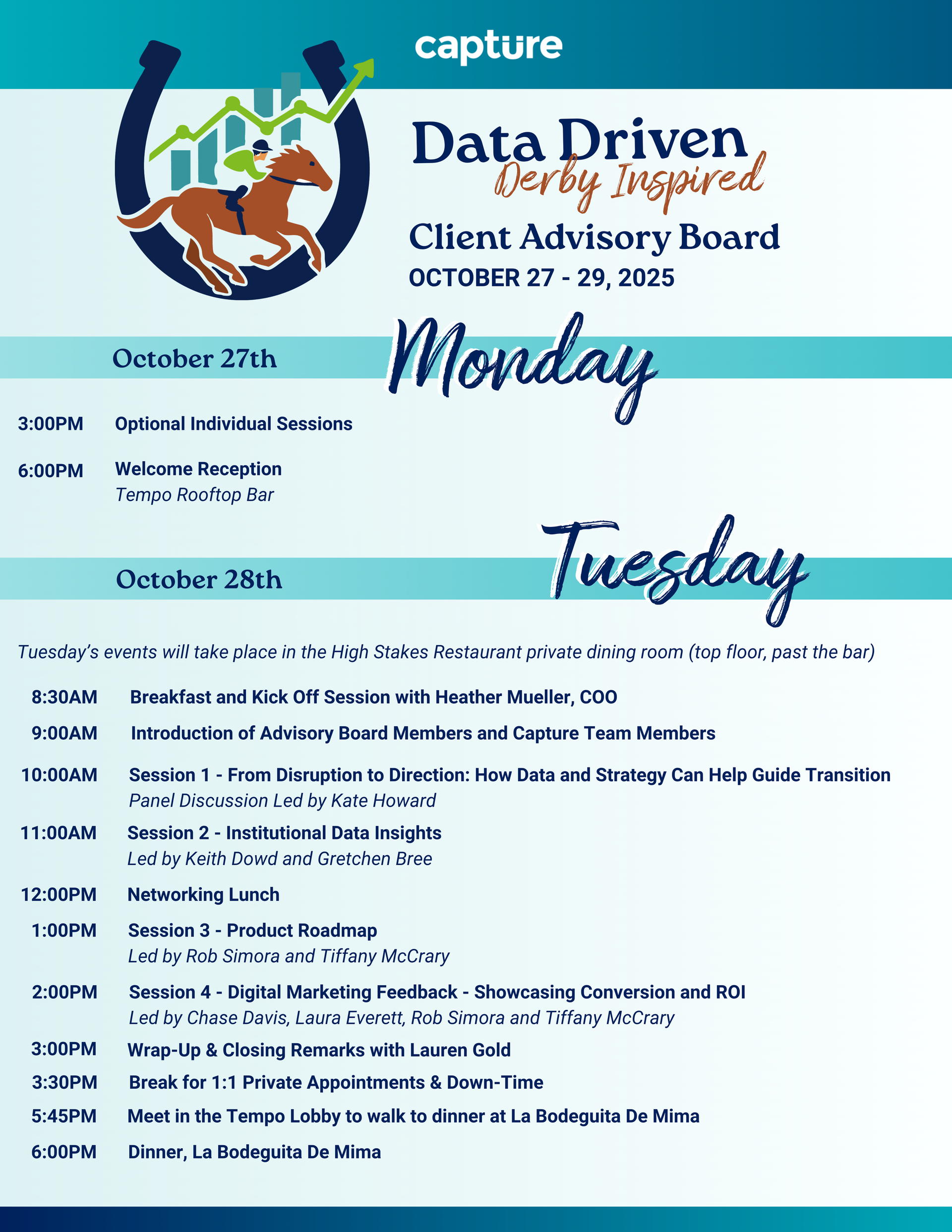 Welcome to Louisville! I’m excited to host you October 27–29 for Capture’s 2025 Client Advisory Board On-site. Over the next three days you’ll spark new ideas in AI-driven enrollment, share best practices, and soak up Bourbon City’s Southern hospitality—from rooftop cocktails at Tempo Hotel to optional Derby Day magic at Churchill Downs.